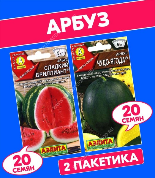 Семена Арбуз красный Сладкий Бриллиант + Арбуз желтый Чудо-Ягода, 2 пакетика
